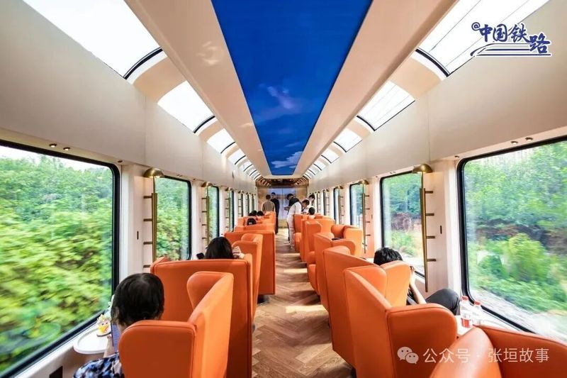 列車由4節(jié)觀光車廂、1節(jié)主題餐車、1節(jié)全景觀光車廂、1節(jié)多功能娛樂車廂組成,可載客208人。